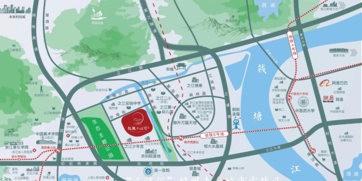项目双地铁环绕,距离6号线米。向西通过之江大桥可快速去往滨江,向北走紫之隧道直达城西。
