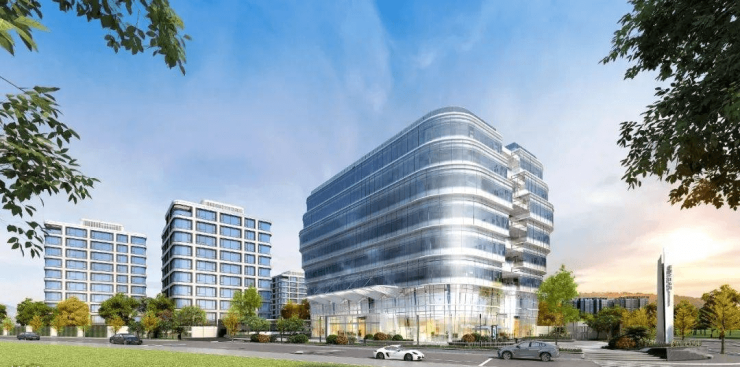 西北侧的主体办公楼的设计突出建筑立面的横向元素,两端嵌入空中花园,曲线倒角和透明般白色玻璃幕墙,使建筑具有了轻微灵活而高度的雕塑化形式。