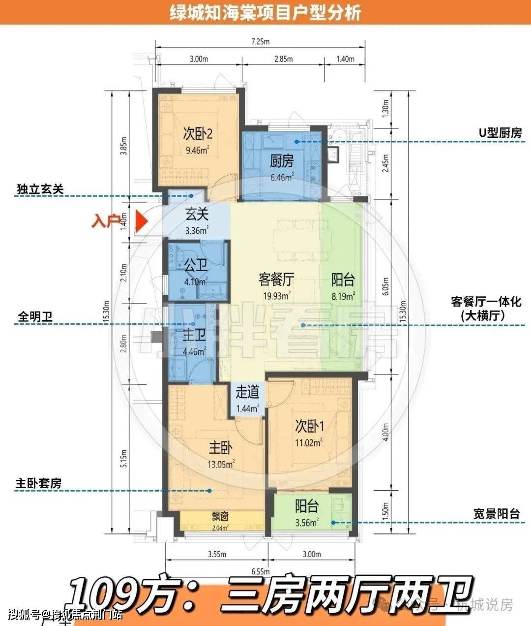 109方户型:三房两厅两卫,独立玄关,横厅边套,生活阳台+休闲阳台(全包),近13米采光
