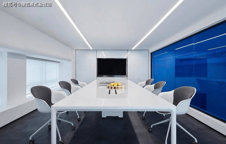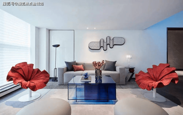 犹如灿烂绽放的花朵造型座椅静置于等候区,中央则安放着交错叠层的透明茶几。其间碰撞交融的烈艳红与经典蓝抢夺所有目光,衍生出兼具时尚新潮与艺术气息的场景。