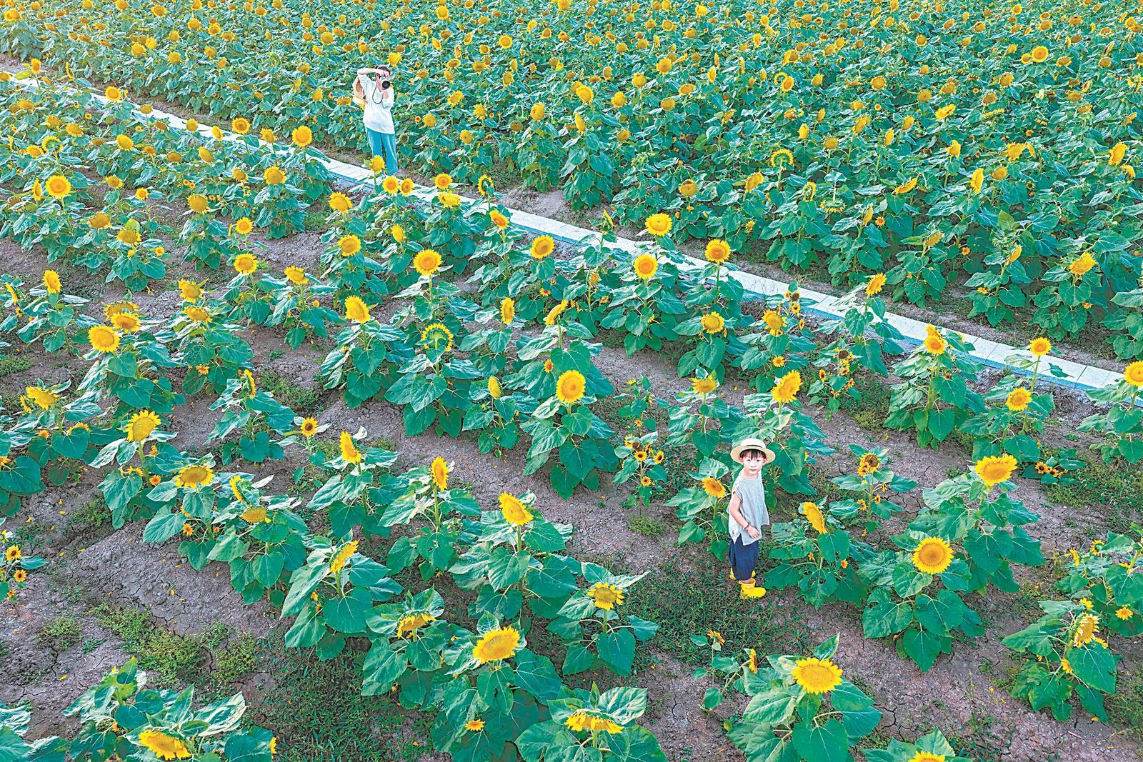 芜湖市湾沚区桃园村的百亩向日葵花海吸引游客游玩拍照。(资料图片)通讯员 王玉实 摄